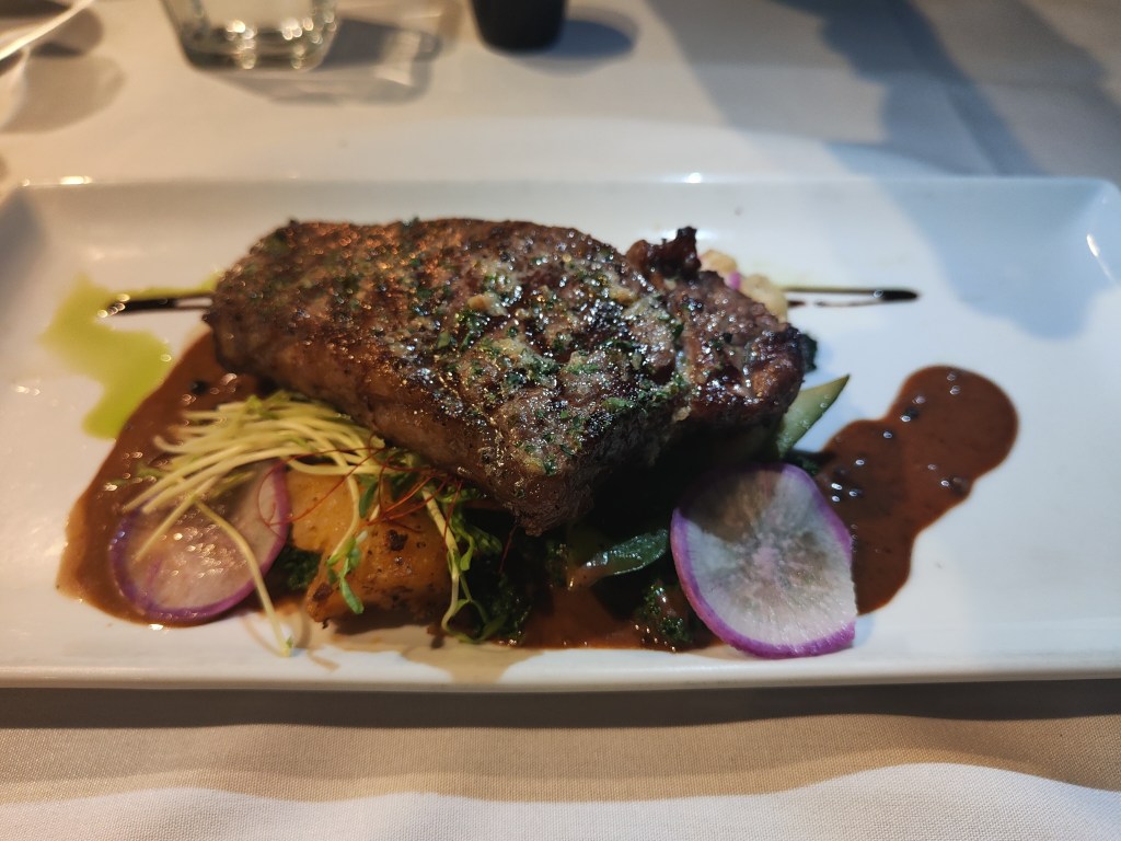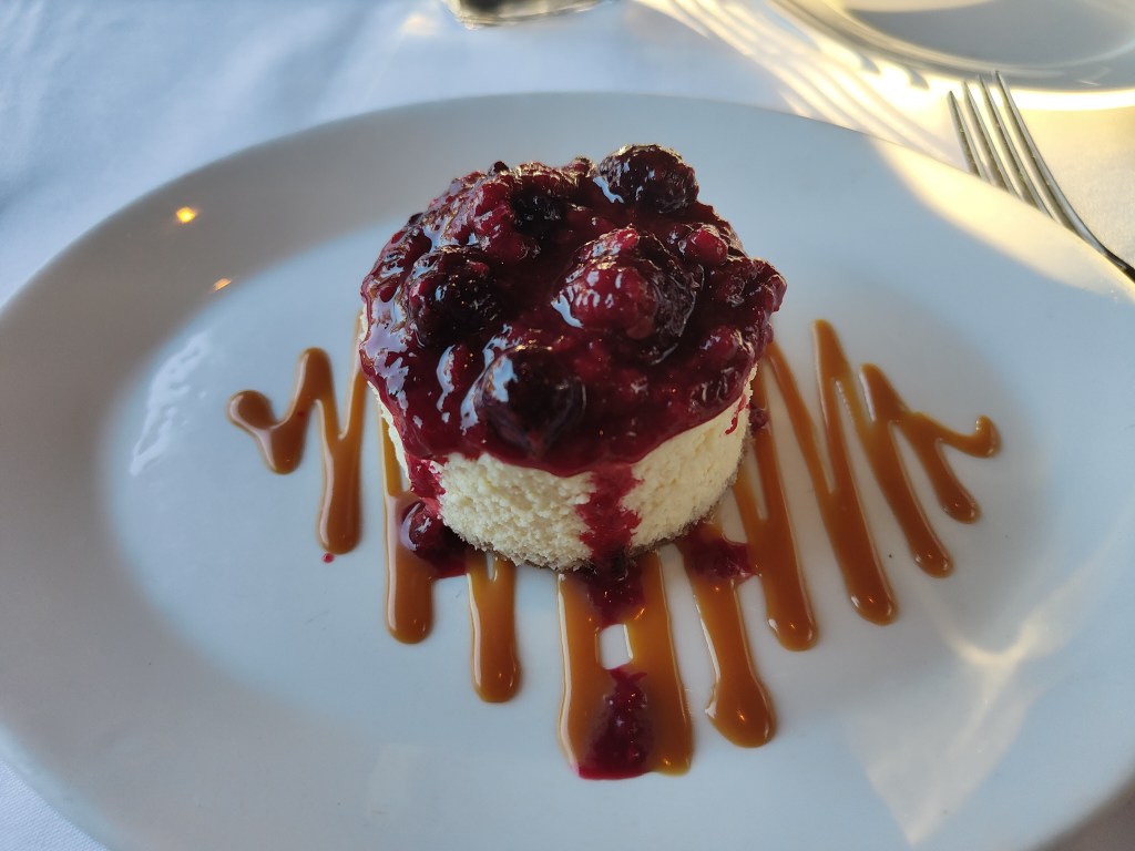 最後推薦的這間餐廳位於伊莉莎白女皇公園內的四季餐廳,說起來已經二訪伊莉莎白女皇公園了,四季餐廳位在公園內的制高點,溫哥華三四月天還是冷冷的,所以我們選擇坐在室內靠窗的位置,如果選擇室外也不擔心冷,會安排在有火爐的位置,由於餐廳位於溫哥華的高點,視野極好,室內窗邊的位置沒有玻璃阻隔,更貼近室外的景觀,可以很好的飽覽溫哥華的景致,跟在旋轉餐廳裡的風景是完全不同的面貌,主餐部分我們點了羊腿和鱸魚,羊腿很嫩沒有什麼羊羶味,鱸魚外酥內嫩,鮮味十足,味道也恰到好處,吃完主餐雖然已經蠻飽的,但還需要甜點的加持才更完美,甜點部分我們選了莓果起司蛋糕,起司香味濃郁甜而不膩,晚餐吃完還可以順便欣賞到絕美的日落,漫步夕陽下呢。